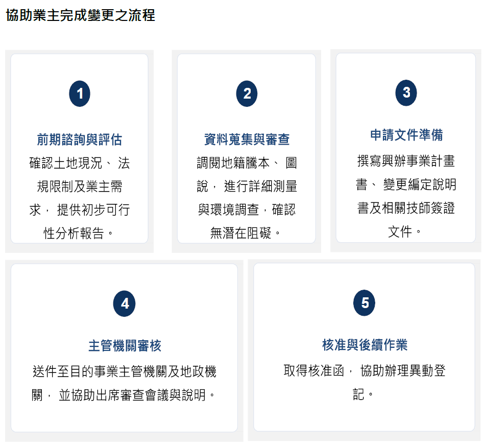 我們擁有豐富的實務經驗, 致力於協助補辦單位突破土地使用限制,無論是農地變更、 工廠擴建或都市土地活化使用, 都能提供策略與執行方案。