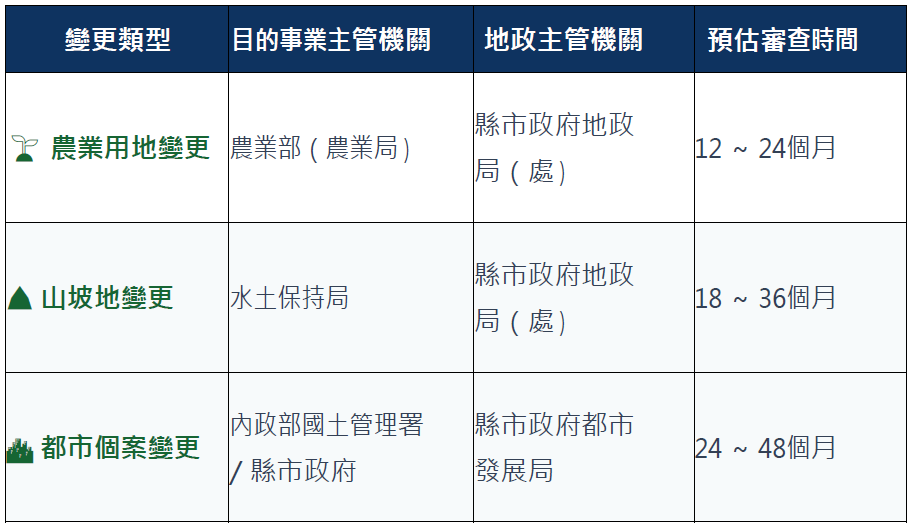 用地變更依據變更類型不同, 需對應不同的主管機關提出申請。 下表整理各類型變更所涉及之關鍵機關及其職責, 以利業主預先掌握審查架構。